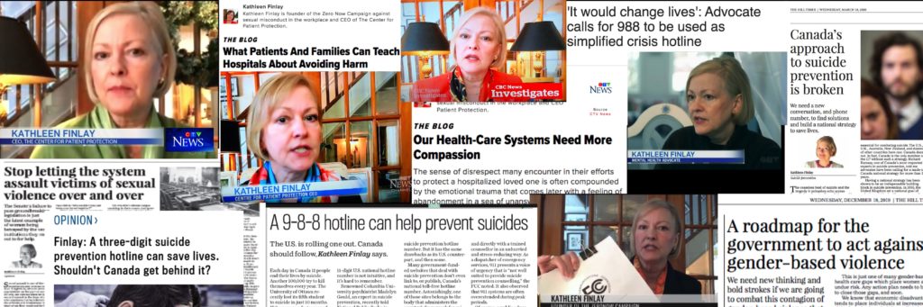 Kathleen Finlay regularly appears in the national media, including CTV National News and the CBC. She is a frequent guest on talk radio and is a regular contributor to leading op-ed pages, including The Hill Times and the Ottawa Citizen. She has written more articles for the Huffington Post on medical errors and innovations in patient safety than any other contributor.